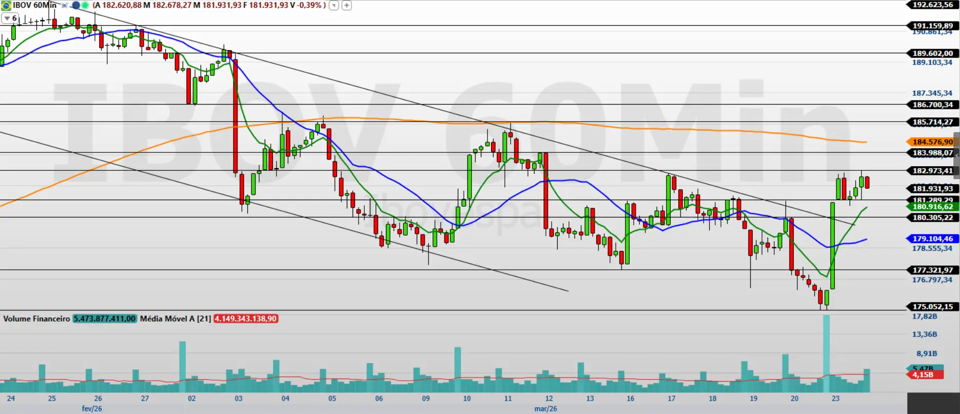 No horizonte mais curto do gráfico de 60 minutos, observa-se que o índice rompeu uma linha de tendência de baixa (LTB) e passou a negociar acima das médias de 9 e 21 períodos. Este movimento é um indicativo de melhoria no fluxo de mercado no curtíssimo prazo. Para que a alta prossiga, o Ibovespa necessita superar a região de resistência compreendida entre 182.975 e 183.990 pontos. Uma confirmação desse rompimento pode levar o mercado a enfrentar novas barreiras em 184.300 e 185.715 pontos, com possíveis alvos intradiários subsequentes em 186.700 e 189.600 pontos.